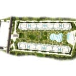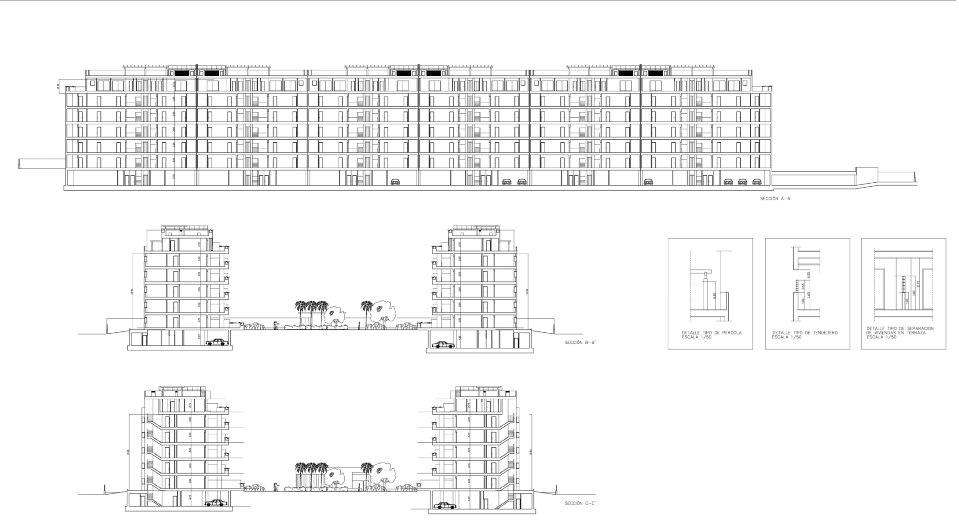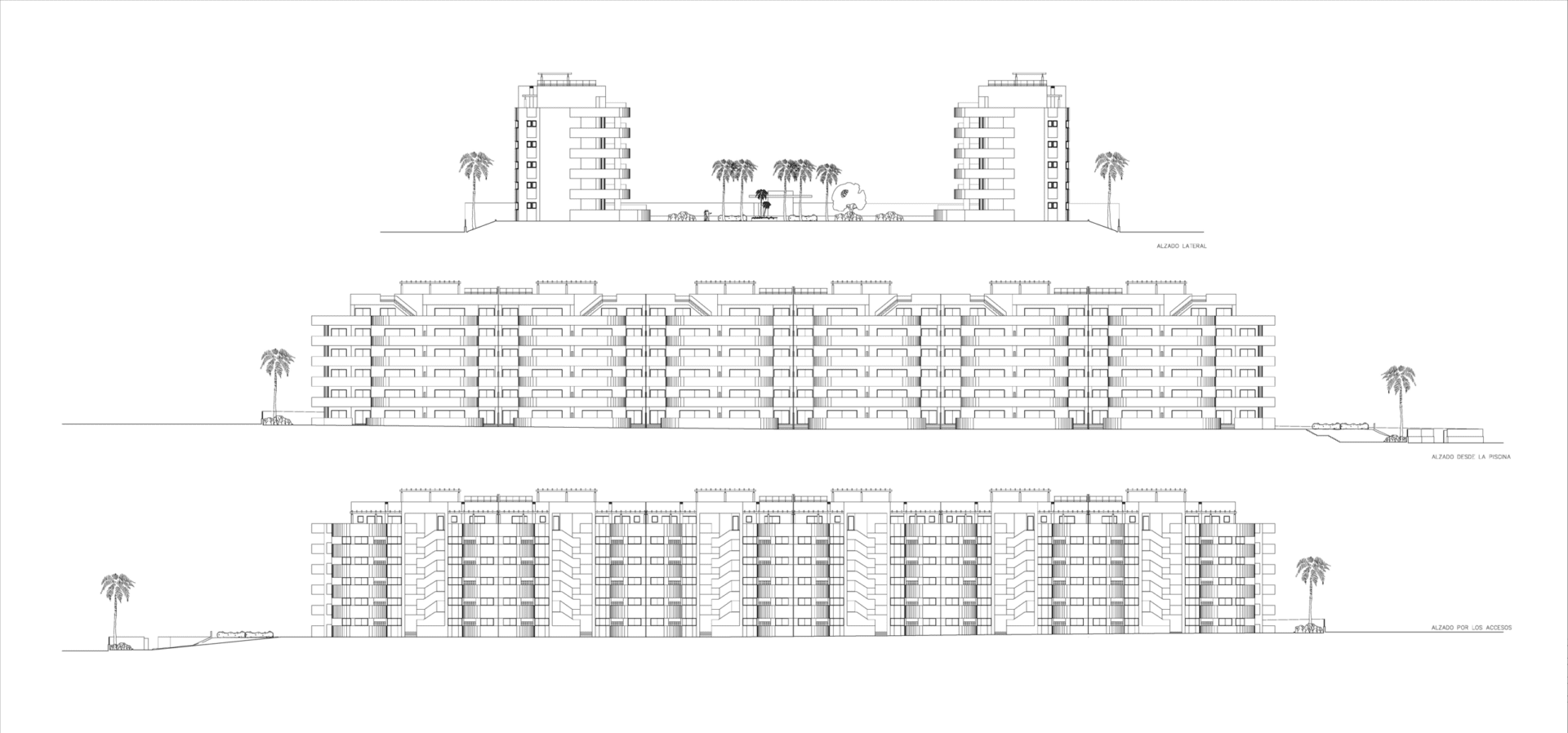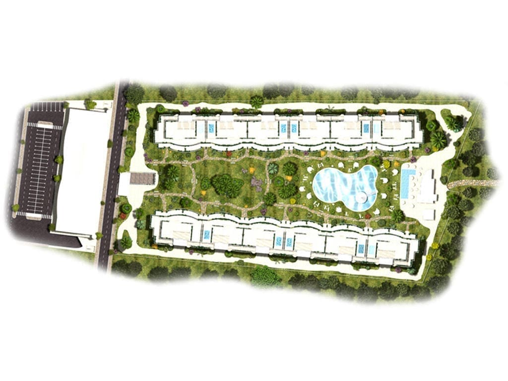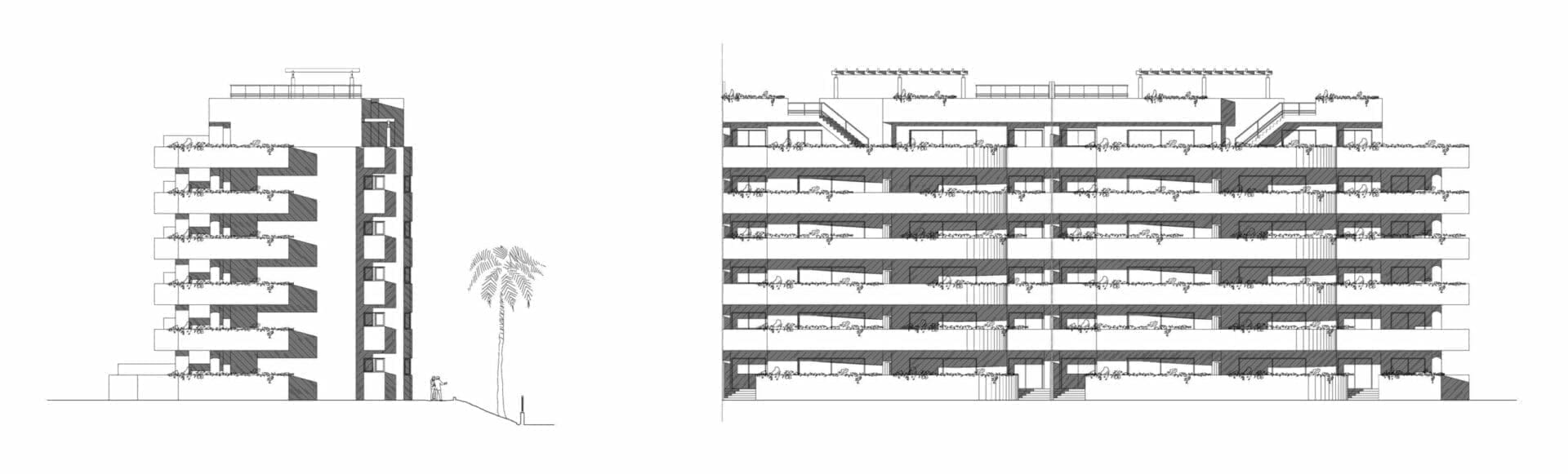 Los dos bloques simétricos, constan de Planta Baja, cuatro plantas sobre rasante y una Planta Ático, con una Planta Sótano dedicada a garaje, trasteros, servicios e instalaciones. En la planta ático se desarrolla el programa para las viviendas más grandes de 4 dormitorios con una gran terraza solárium; mientras que en el resto de las plantas se disponen las viviendas de 2 dormitorios. Las viviendas de planta baja disponen de acceso directo a nivel de los jardines de la zona común, y una terraza ajardinada más grande, de uso privativo.