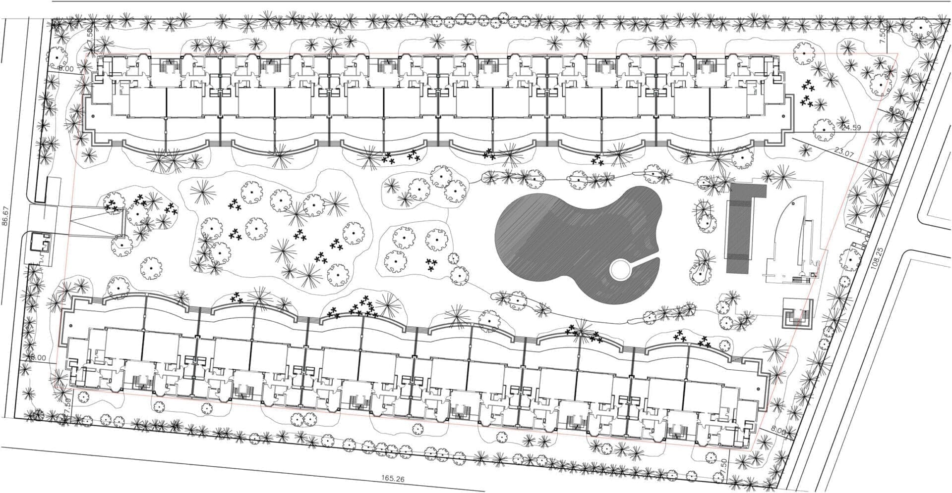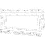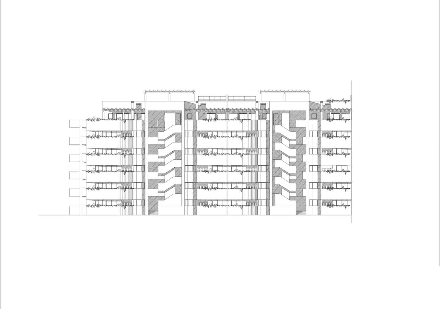El proyecto se resuelve en dos bloques lineales de apartamentos, implantados al mismo nivel. Estos bloques son simétricos disponiéndose de forma paralela a los límites de la parcela en su dimensión más larga, mediante una planta de tipología claramente lineal y terrazas serpenteantes, donde se desarrolla un programa de viviendas pasantes, con ventilación cruzada, de 2 y 4 dormitorios (120 y 12 viviendas respectivamente).