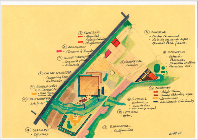 La Ciudad de las Artes y de la Cultura (usos dotacionales culturales, religiosos, educacionales, etc.): para desarrollar los equipamientos dotacionales específicos de carácter cultural, que posibilitasen la afluencia de un relevante aforo de público (un gran Auditorio, un Gran Teatro, una Escuela de Circo junto con la Plaza de los Templos).