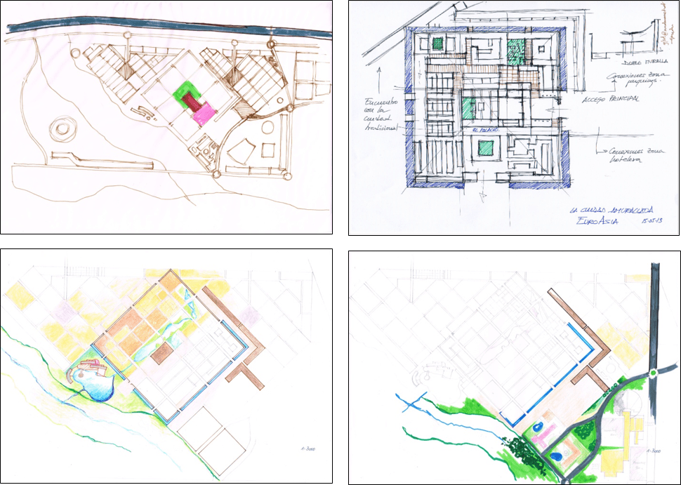 Cuando nos encargaron este proyecto nuestro cliente nos transmitió que se trataba de promover la construcción de un novedoso y singular enclave en el que se reprodujesen fielmente los elementos básicos de una ciudad oriental en un municipio grande a las afueras de Madrid. Dicho hito urbano (sugestivo, compacto, dinámico y pluriforme) habría de ser “un ambicioso exponente de la cultura y de los rasgos más genuinos compartidos por aquellos países que lideran el contemporáneo avance de la humanidad”