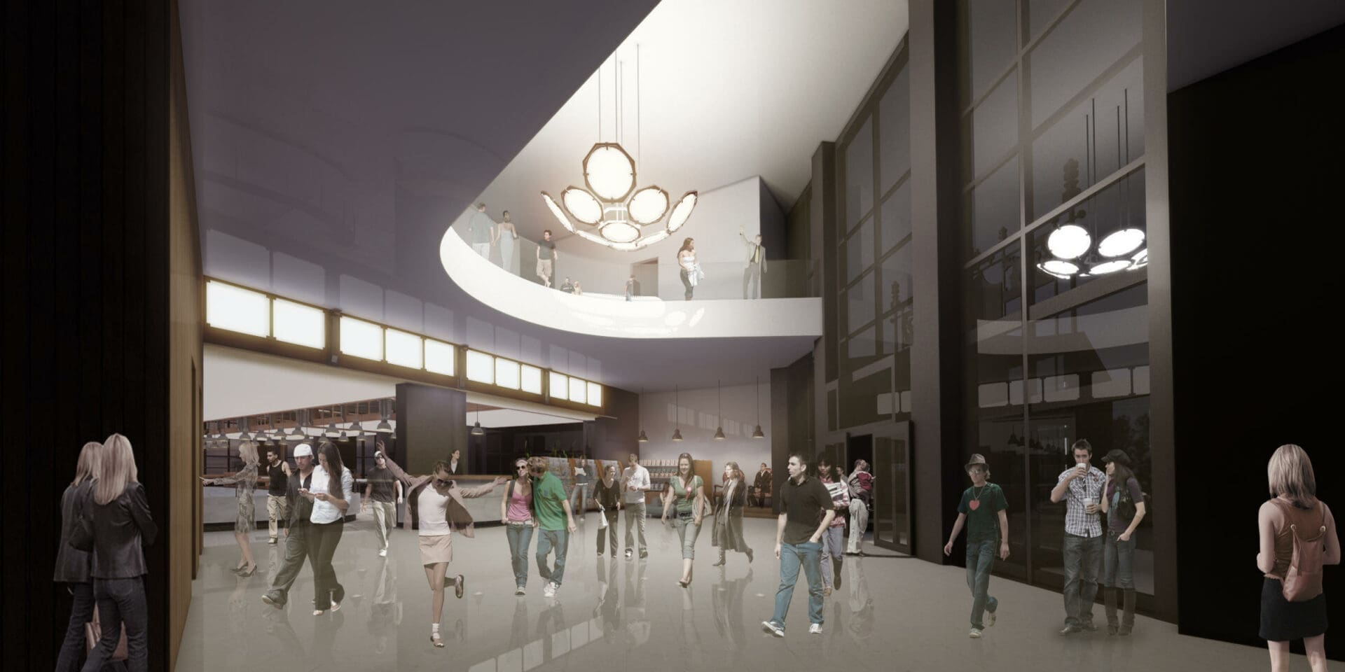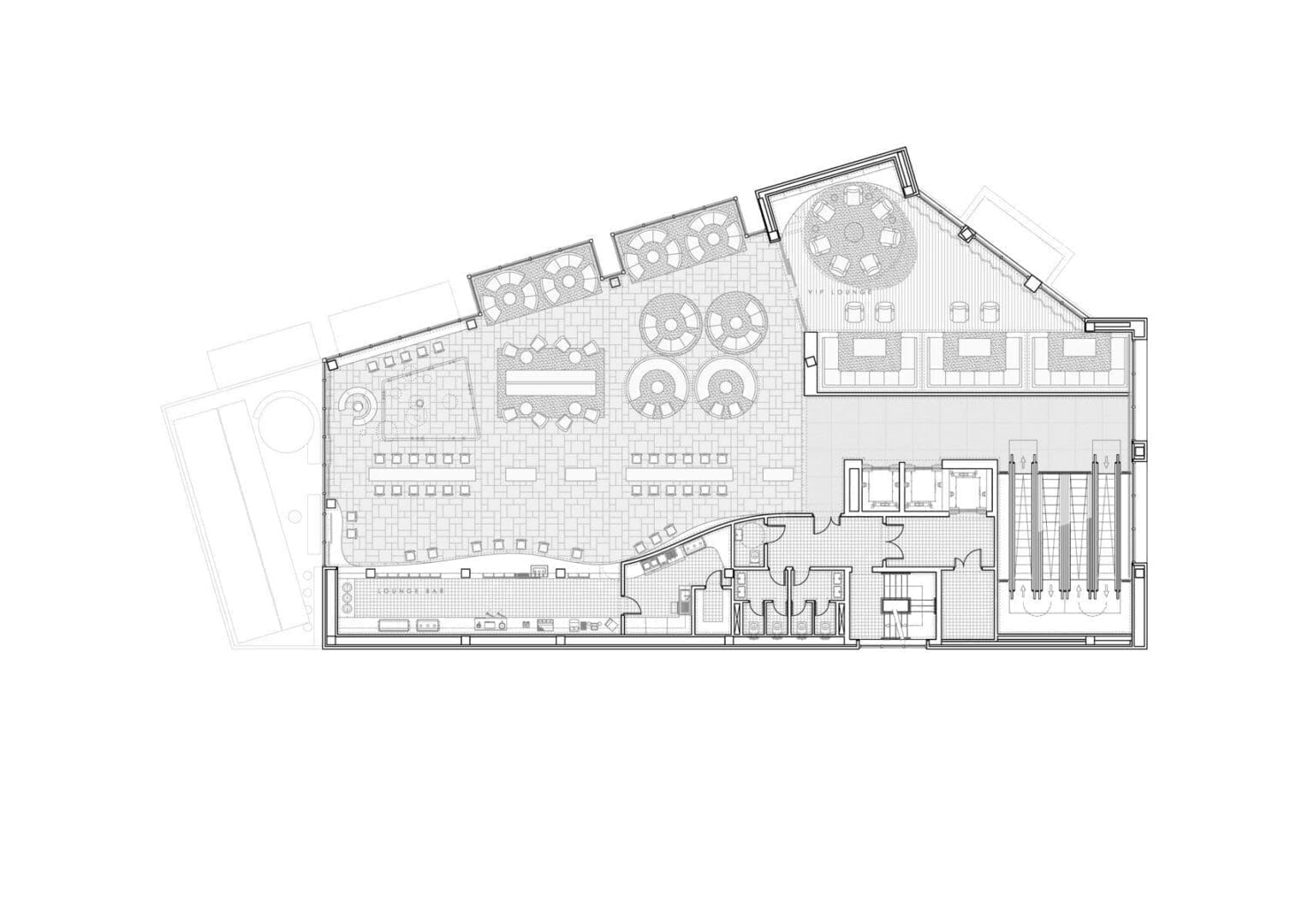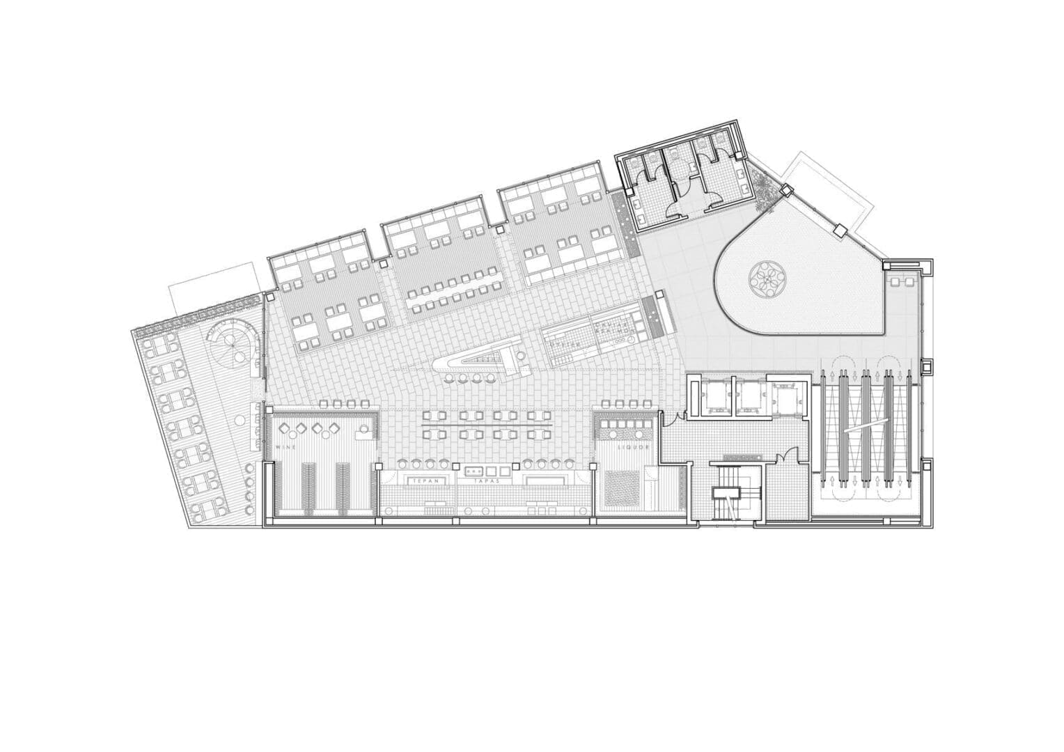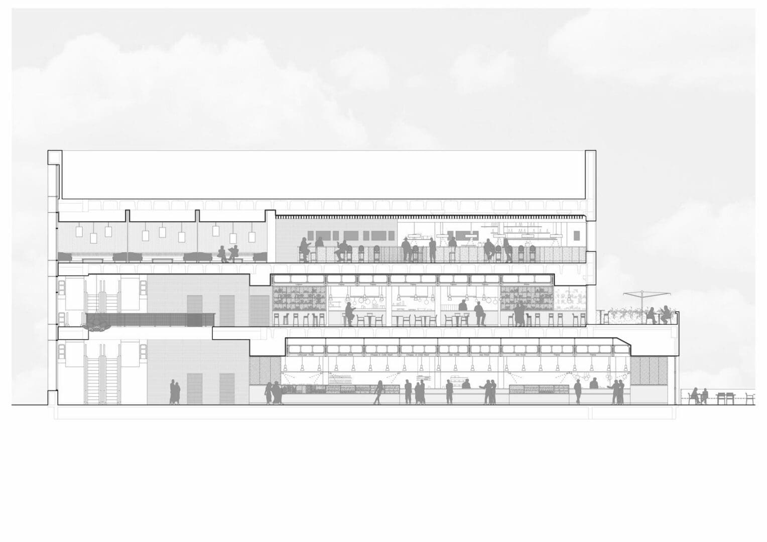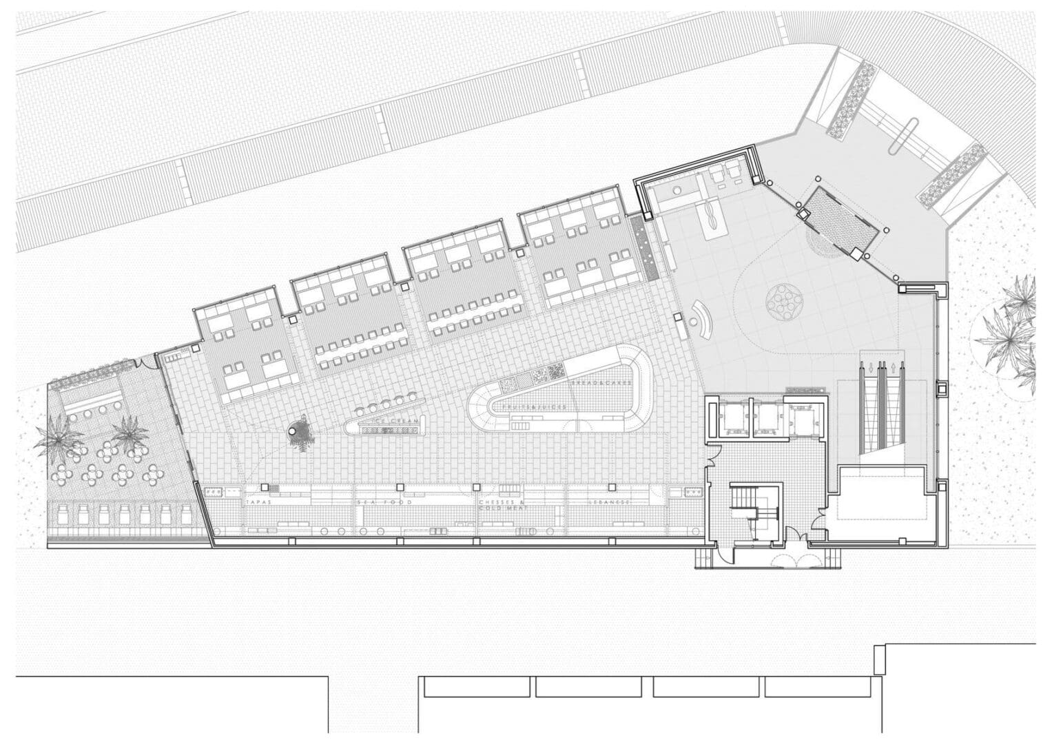 Los recorridos, las áreas de servicio, las zonas de ventas y los espacios para clientes sentados y de pie se estudiaron para evitar la aglomeración y favorecer la fluidez del paso y permitiendo a la vez una cómoda y agradable estancia mientras se disfruta de la comida o de la bebida en los diversos puestos y establecimientos.