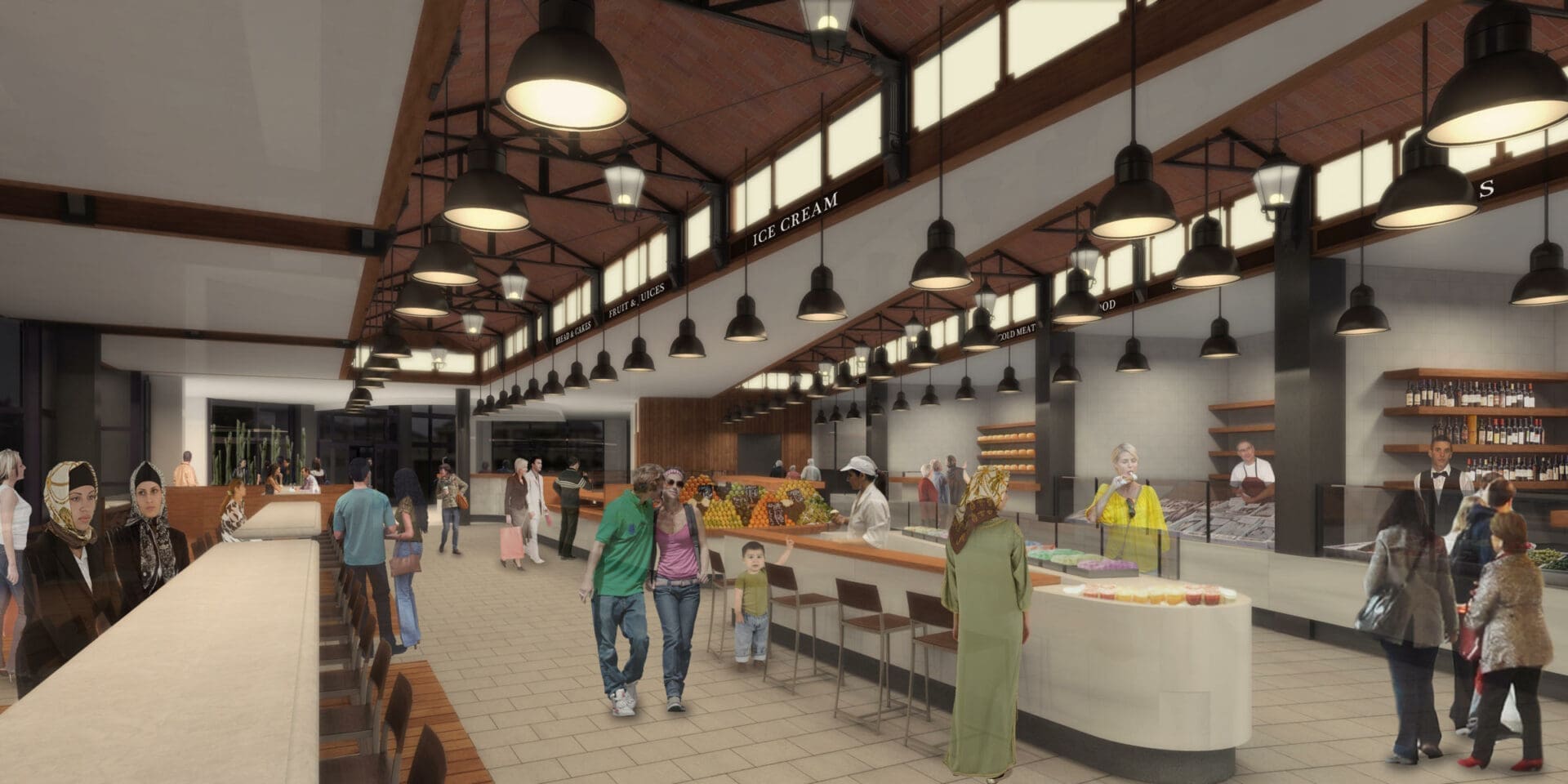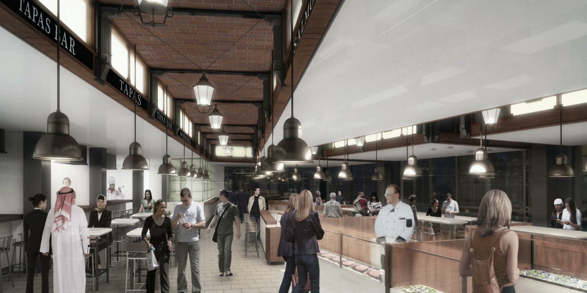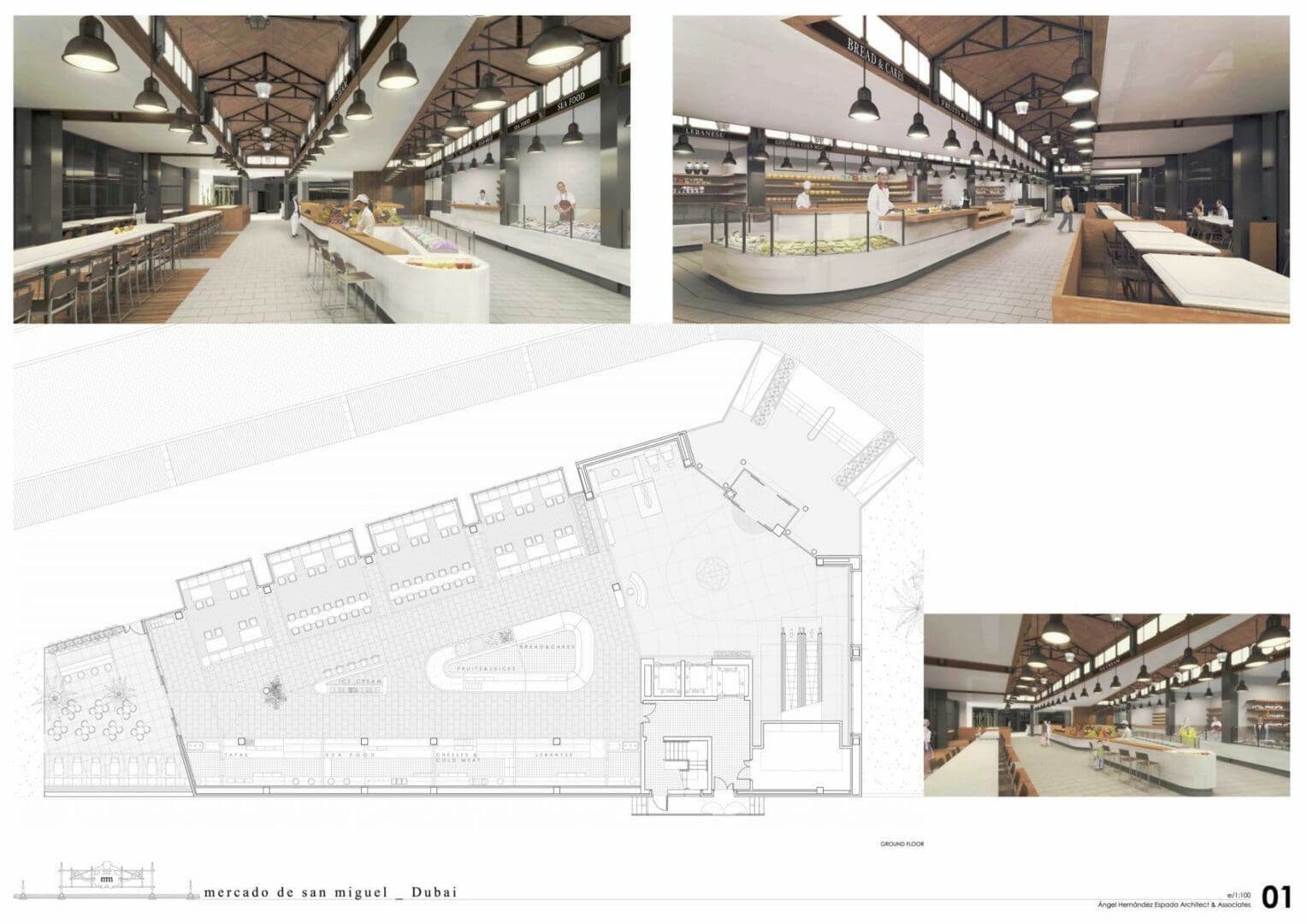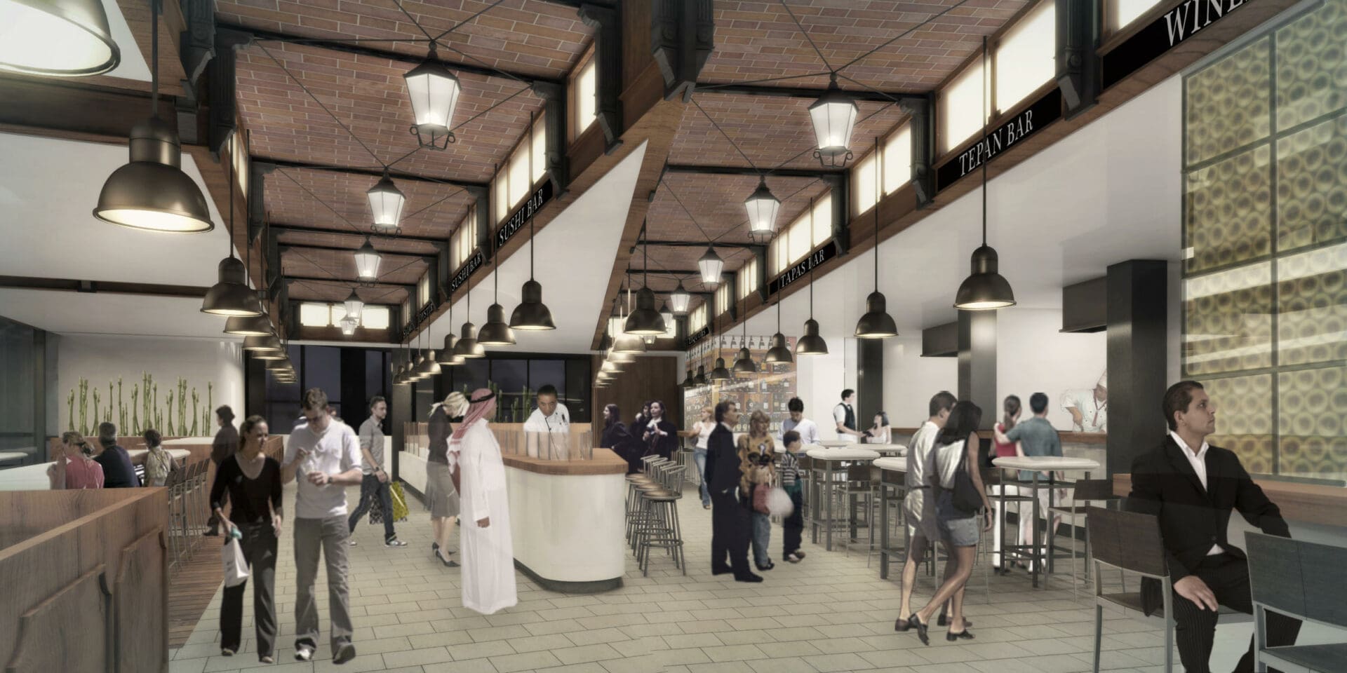 La idea fundamental de este proyecto era transformar un edificio en Dubai en un nuevo espacio, que combinara la tradición de los mercados europeos de principios del siglo 20 con los nuevos usos que se están implantando en este tipo de edificios, combinando patios de comida y áreas de ocio y descanso.