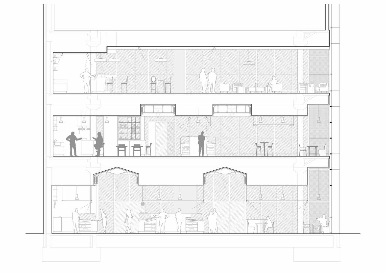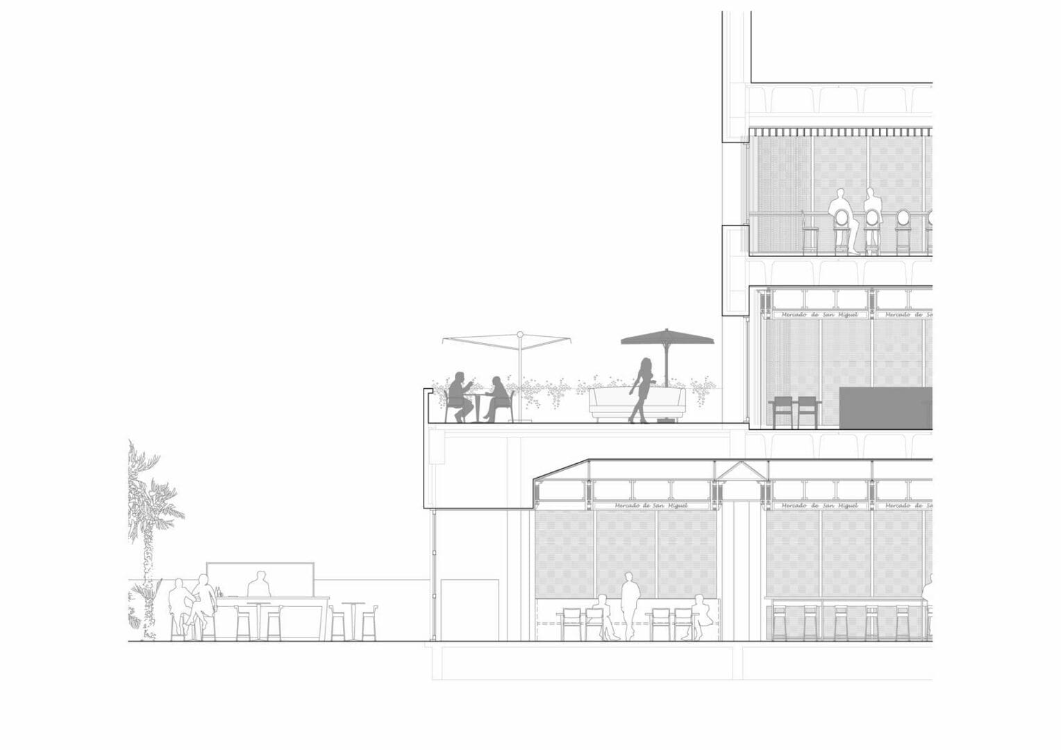 En las plantas baja y primera se proyectó un lugar inspirado en el concepto de uso del actual mercado de San Miguel de Madrid, en España, mientras que en la planta segunda se proyectó un espacio para un ambiente sofisticado y moderno, a la vez que un reservado de estilo clásico y ejecutivo. El estilo en la decoración de cada planta refleja el uso característico de cada una de ellas.