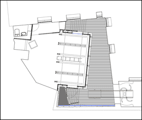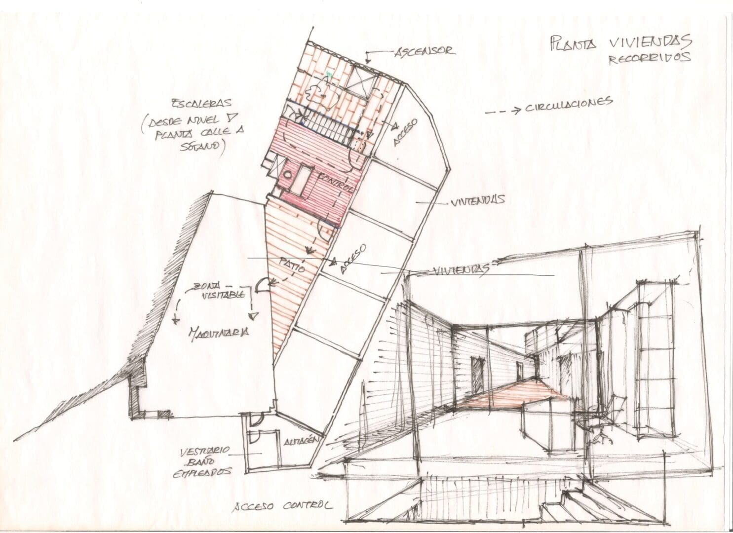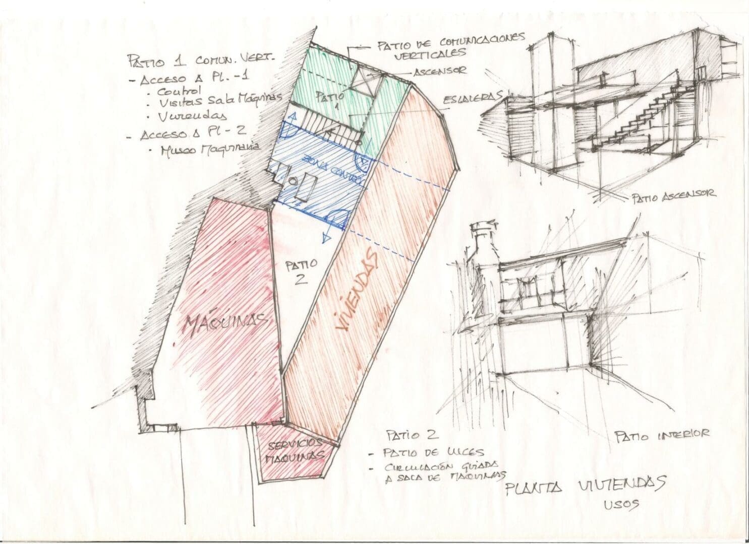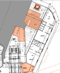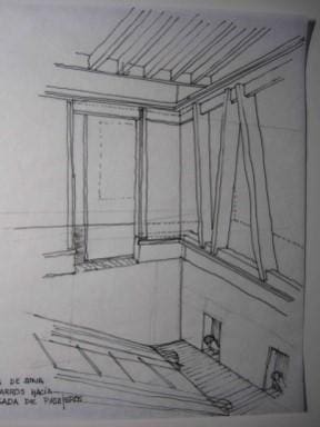 - La implantación de unas nuevas comunicaciones verticales, mediante la disposición de unas escaleras que bajasen en dos tramos hasta la planta -2. Estas nuevas escaleras se situarían en el patio adosado donde estaba la antigua escalera de acceso a las viviendas, que sería demolida, cambiando su posición, desarrollo y materialidad.